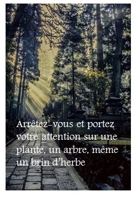 Est-ce qu’il y a des sons que vous pouvez entendre venant de cette plante ? Peut-être le bruit du vent dans le feuillage si c’est un arbre ? Touchez-la. Quelles sont les textures que vous notez ? Observez-la. Quelle est sa couleur ? Est-elle intacte ou mangée par des insectes ? Qu’est-ce que vous observez ? De quoi a-t-elle l’air? Sentez-la. Est-ce que vous pouvez découvrir une odeur? Est-ce que l’odeur vous rappelle quelque chose? Frottez vos doigts sur une feuille. Est-ce que cela laisse une odeur, une trace sur vos doigts?