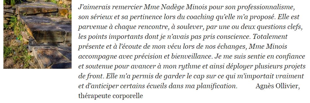 C’est pour cela que je suis devenue coach professionnelle. Je suis fière de pouvoir permettre des résultats comme ceux décrits par Agnès mais je suis aussi à la fois très humble. Humble, car ce que je fais est faciliter, faire ressortir ce qui est déjà en vous.