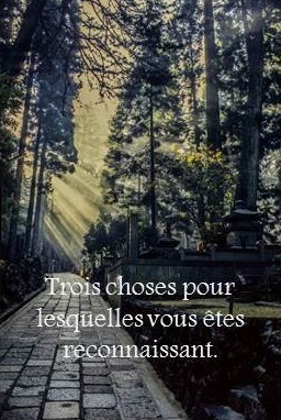 Il a été montré que prendre note des choses pour lesquelles nous sommes reconnaissants augmente notre bien-être. Cela nous force à penser de manière positive. Alors cette semaine, je vous demande de noter chaque jour aux moins trois choses pour lesquelles vous êtes reconnaissant, des choses qui vous ont fait sourire, rire, aimer.
