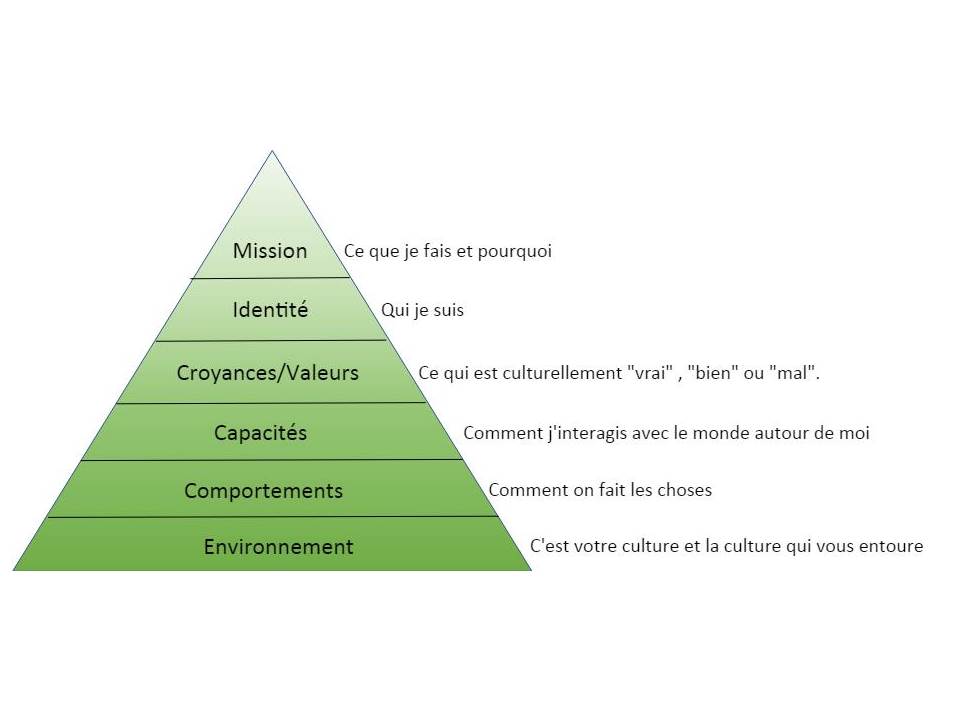 Les niveaux qui nous définissent ont été articulés par Robert Dills sur la base de travaux antérieurs par d’autres auteurs comme décrit dans la référence (1). Ils sont appelés niveaux neurologiques (voir figure).