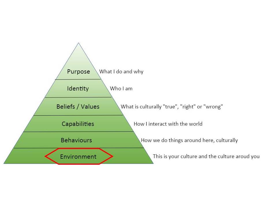 The cultural environment in this context also needs to include your social environment. Here, it is all what you have learned over the years, consciously and unconsciously, from your family, friends, teachers and all the groups you belong to. This will translate into the higher levels of Behaviours, Capabilities and so on and I’ll touch on those in later posts.